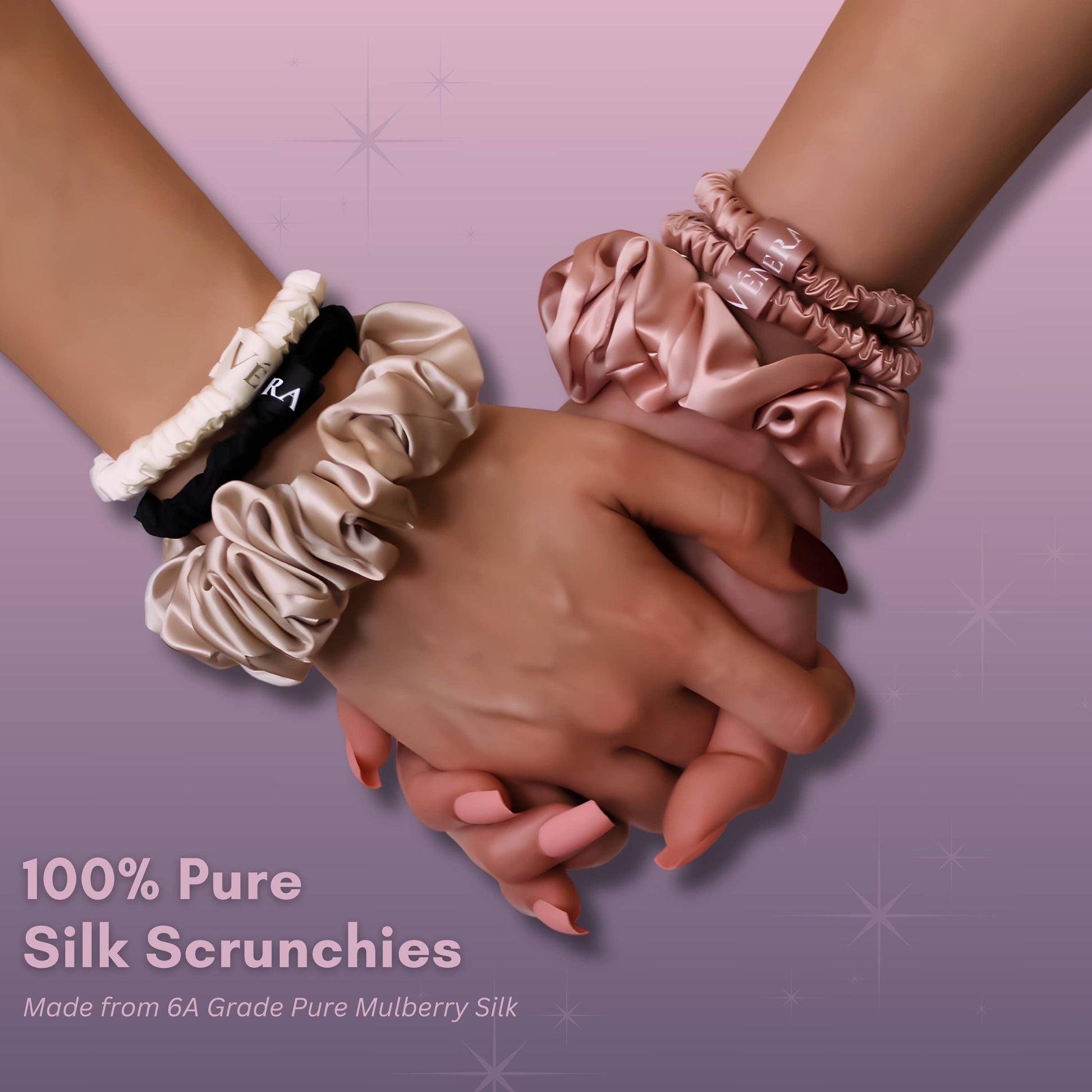 Crafted from 100% pure mulberry silk, these scrunchies are designed to be gentle on your hair while adding a soft, polished finish to any look. The smooth silk surface helps reduce breakage, creasing, and tension—making them ideal for both day and night wear.
